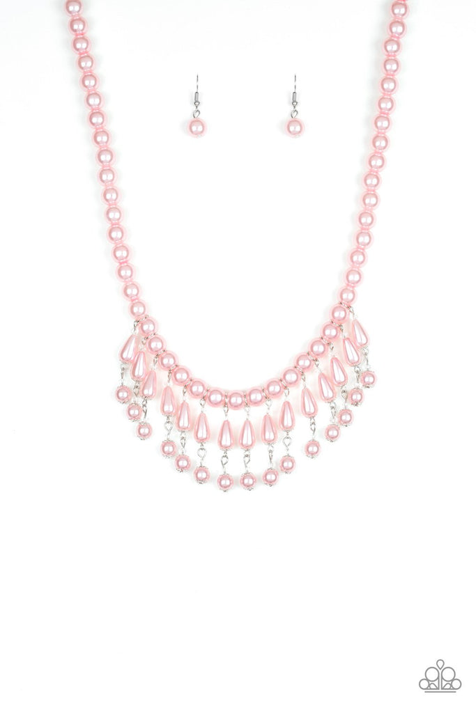 Pearly pink teardrop beads link with classic pink pearls as they drip from a timeless strand of pink pearls. Sprinkled with dainty crystal-like accents, the refined fringe cascades below the collar for a glamorous finish. Features an adjustable clasp closure.