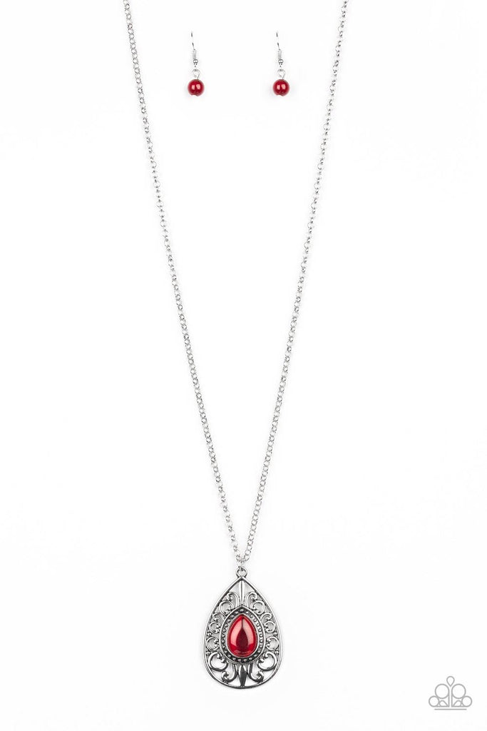 A glowing red moonstone is pressed into the center of a silver teardrop pendant swirling with regal filigree for a regal finish. Features an adjustable clasp closure.