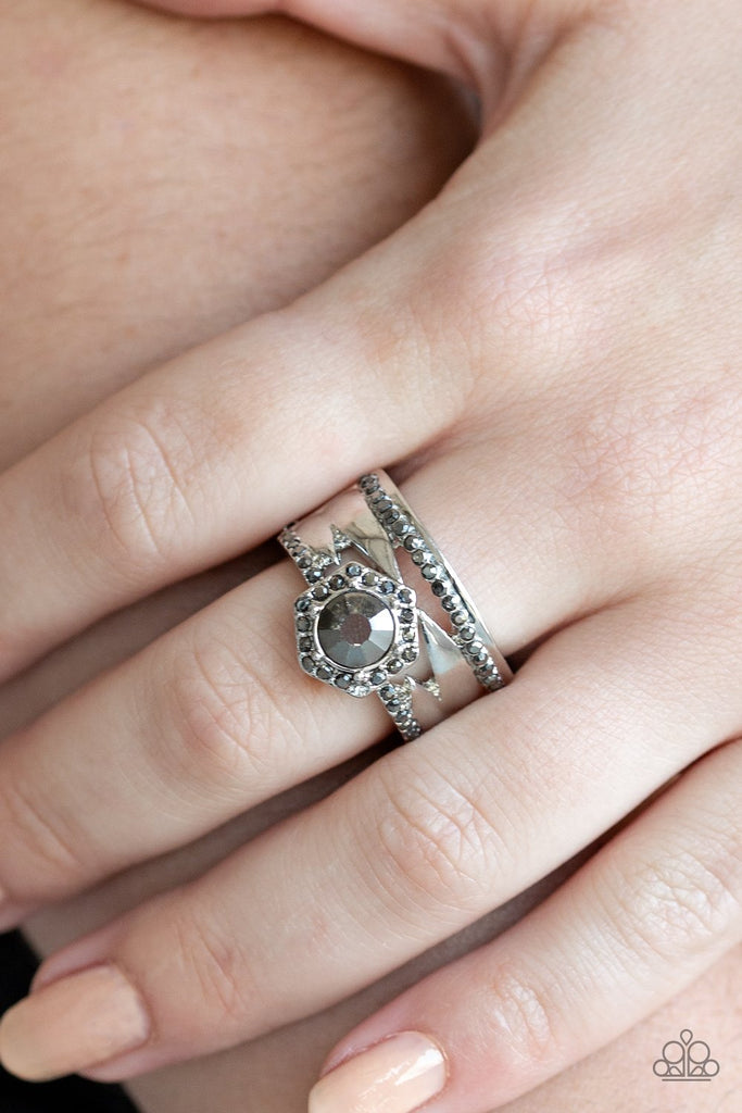 A collision of glistening silver bands and hematite rhinestone encrusted bands stack across the finger. Featuring a glittery hematite rhinestone center, a silver hexagon frame crowns the top of the layered bands for an edgy finish. Features a stretchy band for a flexible fit.