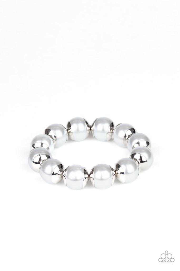 Capped in silver fittings, oversized silver pearls are threaded along a stretchy band around the wrist for a refined look.