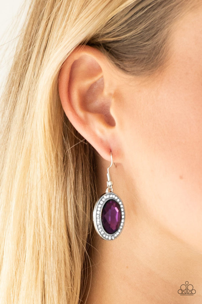 An oversized purple gem is pressed into the center of a silver frame radiating with glassy white rhinestones for a glamorous look. Earring attaches to a standard fishhook fitting.