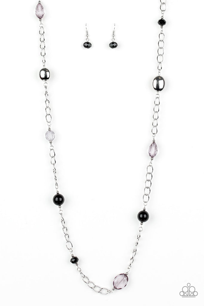 A collection of crystal-like, shiny silver, and shiny black beads trickle down a shimmery silver chain for a refined flair. Features an adjustable clasp closure.