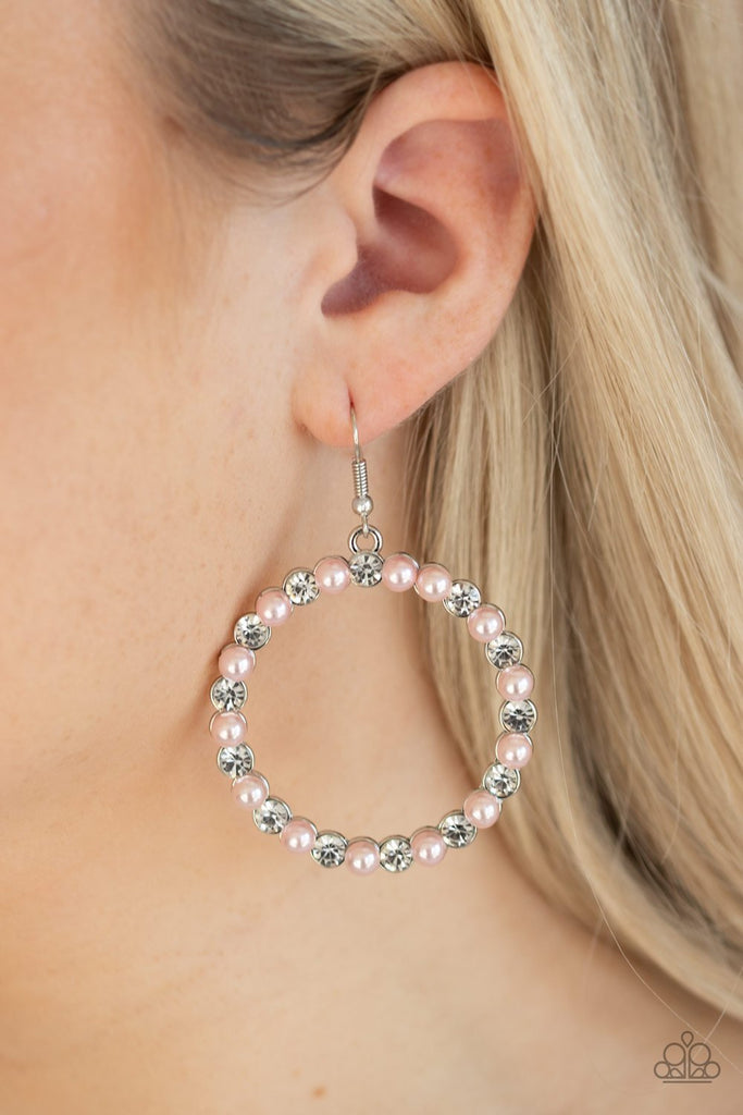 Bubbly pink pearls and glassy white rhinestones alternate along the front of a shimmery silver hoop for a timeless look. Earring attaches to a standard fishhook fitting.