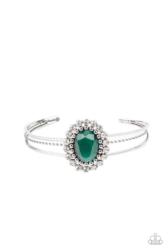 Bordered in glitzy rings of glittery white rhinestones and shiny silver studs, a faceted Leprechaun gem adorns the center of an ornately layered silver cuff for a flowery fashion.