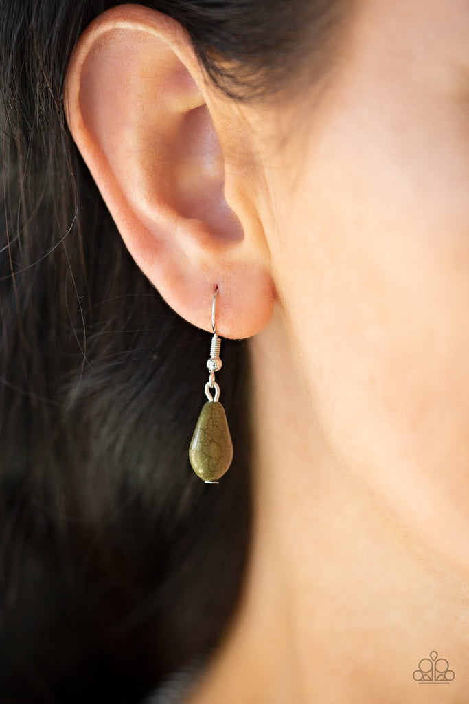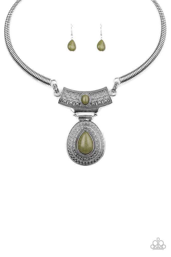 Etched in linear textures, bowing silver bars link with an ornate silver plate dotted with an earthy green stone. Embossed in dizzying tribal inspired patterns, an oversized green stone dotted teardrop pendant swings from the bottom of a courageous finish. Features an adjustable clasp closure.