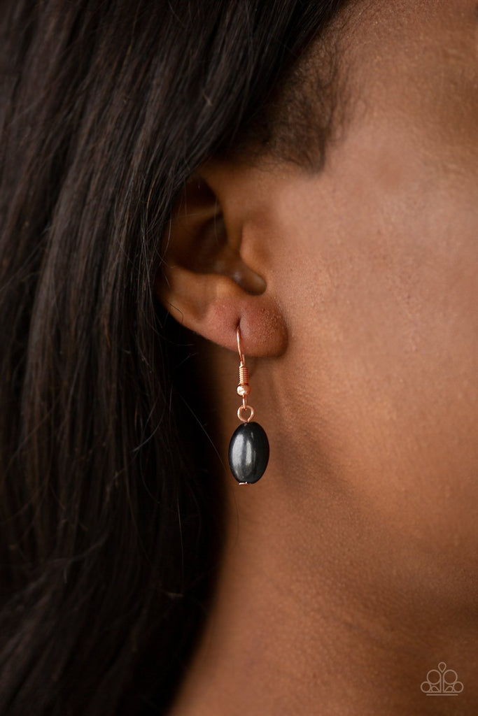Threaded along a metallic rod, a smooth black stone gives way to angular shiny copper frames at the bottom of a shiny copper chain for a seasonal flair. Features an adjustable clasp closure.