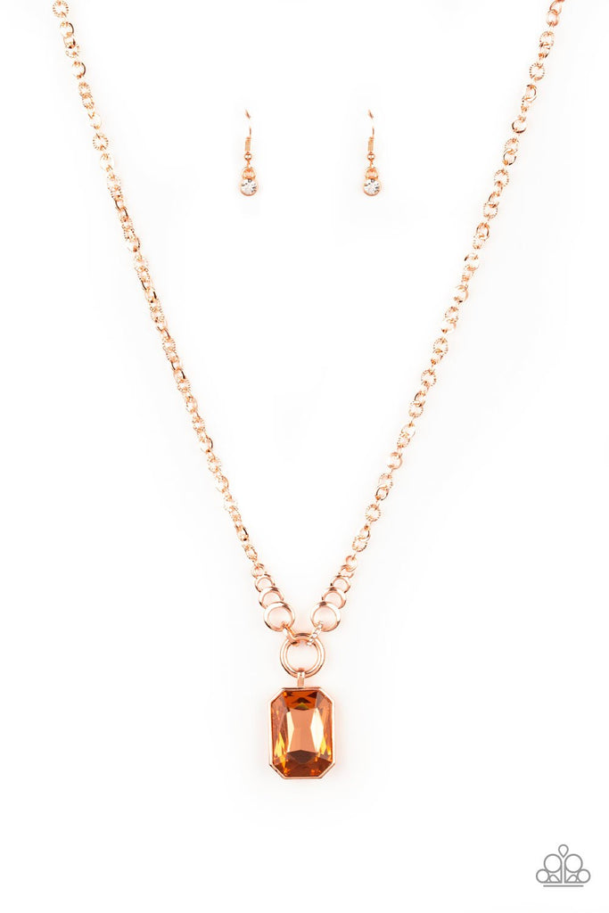 Featuring a regal emerald style cut, an oversized gem swings from the bottom of dramatic white rhinestone encrusted shiny copper fittings for a glamorous look. Features an adjustable clasp closure.