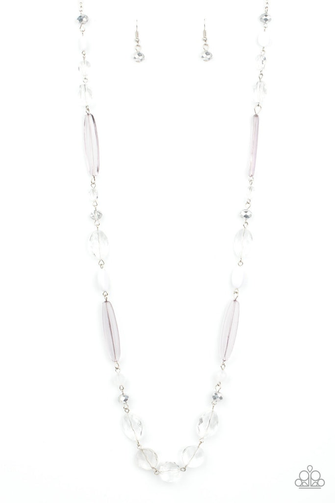 Varying in shape and shimmer, faceted white and metallic crystal-like beads trickle down the chest for a whimsical look. Features an adjustable clasp closure.