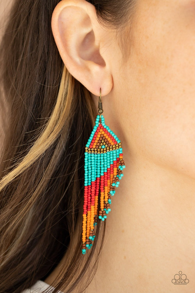 Strands of blue, red, orange, brown, and brass seed beads colorfully weave into a vivaciously beaded fringe. Earring attaches to a standard fishhook fitting.