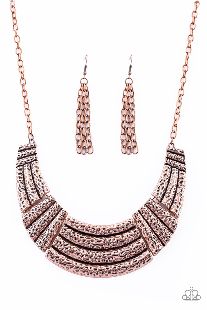 A collection of hammered copper plates connect into a dramatic half-moon pendant below the collar for a fierce look. Features an adjustable clasp closure.