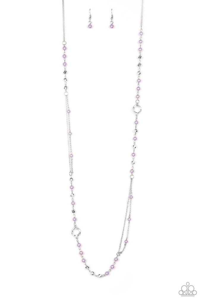 A collection of purple pearls, twisting silver hoops, and faceted silver beads trickle along an asymmetrical silver chain for a refined look. Features an adjustable clasp closure.