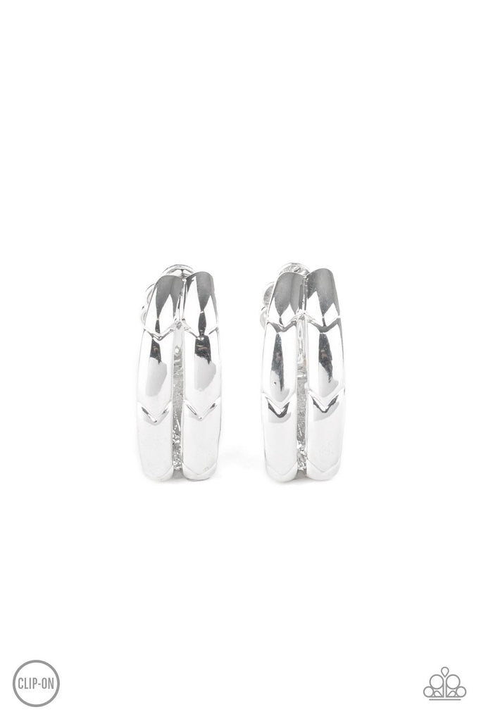 Delicately etched in geometric detail, two glistening silver bars sharply curl into an abstract frame for a classic finish. Earring attaches to a standard clip-on fitting.