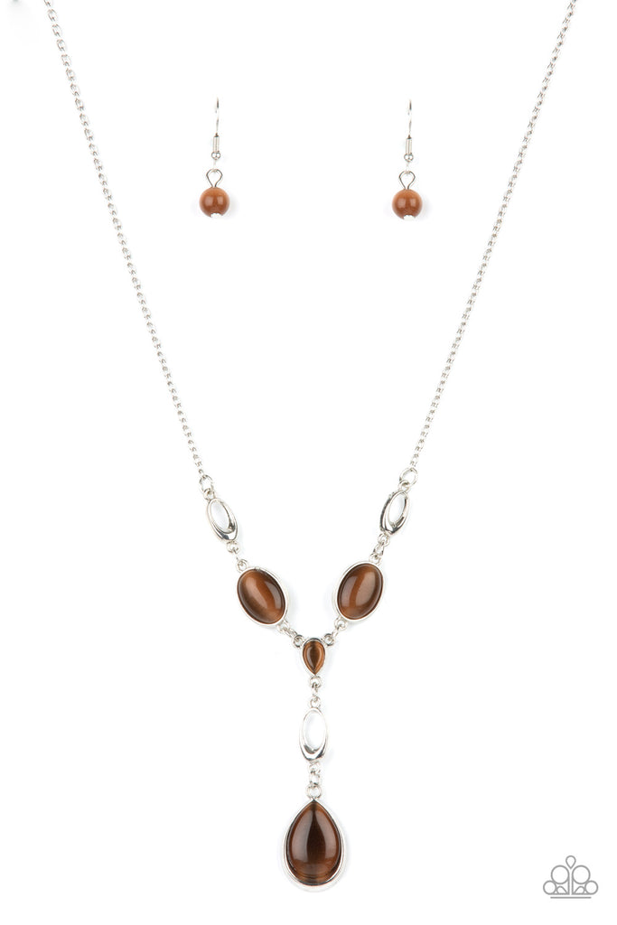 Smoldering brown cat's eye stones and silver accents delicately link across the collar. A stunning brown cat's eye teardrop pendant swings from a silver loop for a sophisticated and refined finish. Features an adjustable clasp closure.
