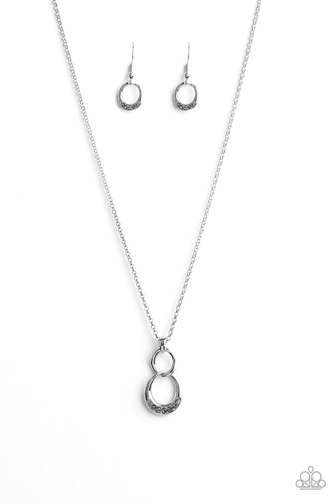 An asymmetrical silver ring links with a smoky rhinestone encrusted silver ring below the collar for a refined look. Features an adjustable clasp closure.