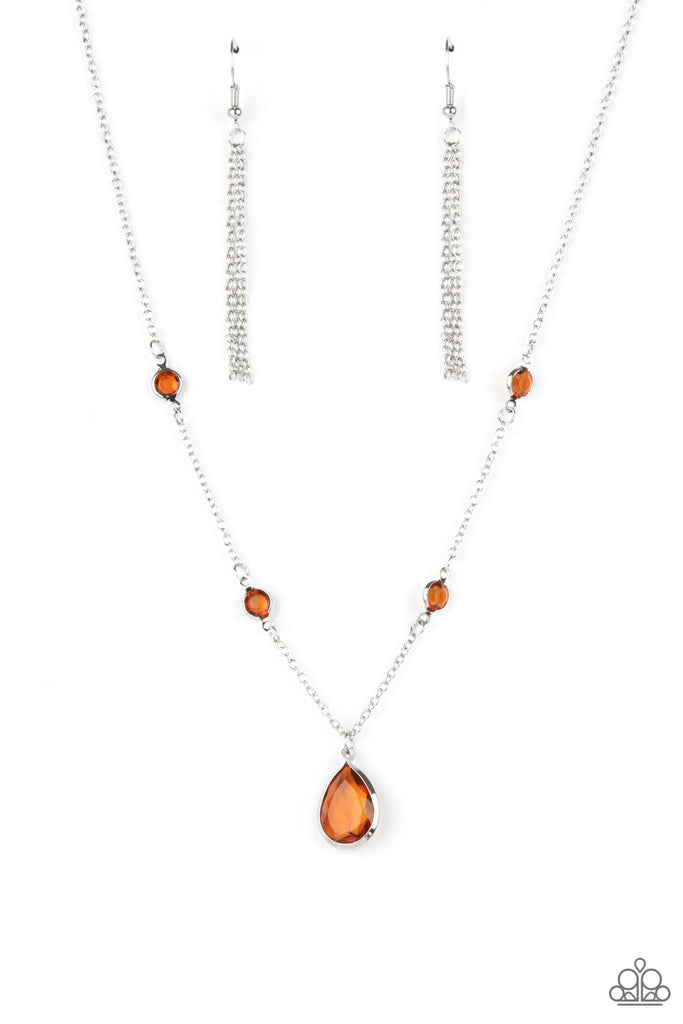 A stunning brown teardrop gem encased in a silver frame dips elegantly below the collar. Small round brown gems accent the silver chain for a delicate and dreamy display. Features an adjustable clasp closure.