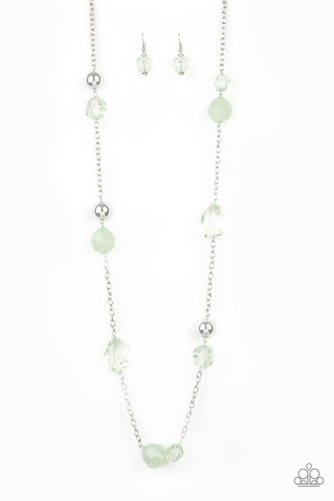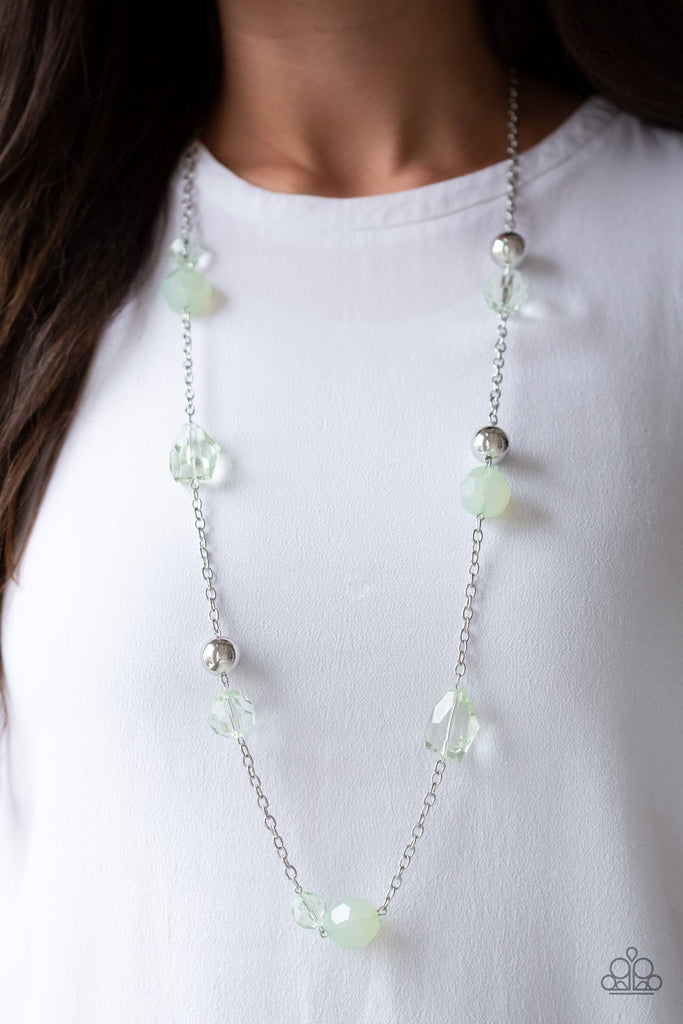 Infused with oversized silver beads, a collection of glassy and opaque green crystal-like beads trickle along a shimmery silver chain for a whimsical look. Features an adjustable clasp closure.
