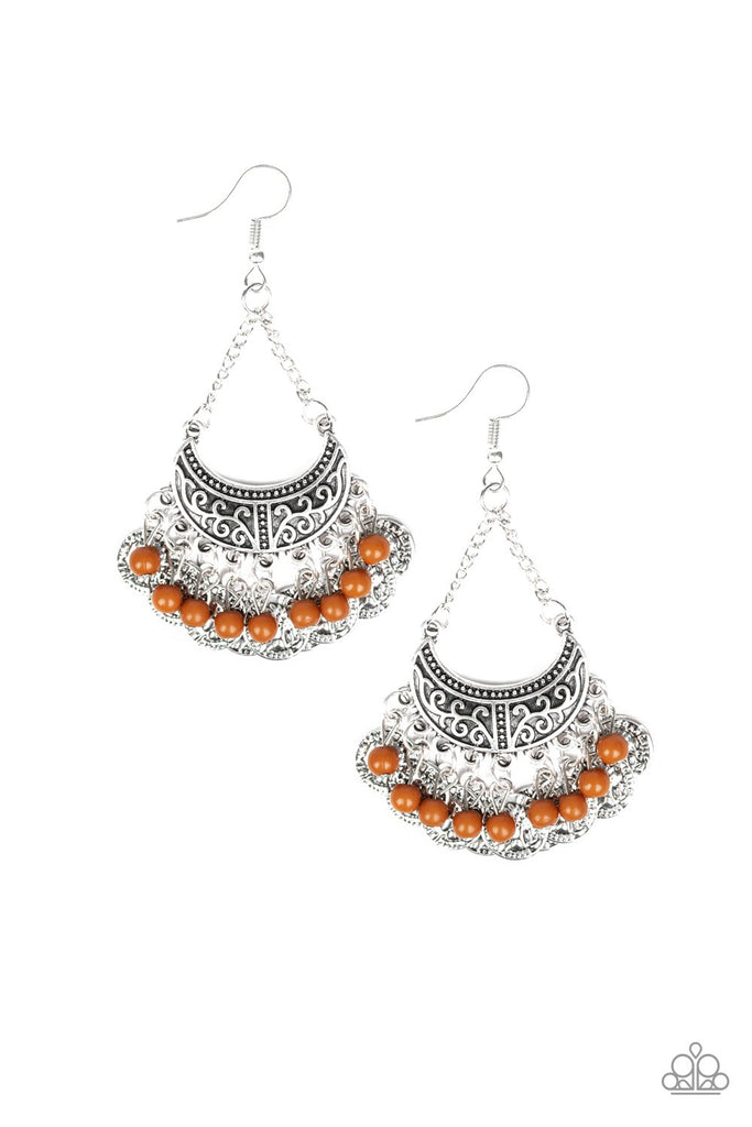Silver coin-like discs and dainty brown beads swing from the bottom of an ornate silver half-moon frame, creating a boisterous fringe. Earring attaches to a standard fishhook fitting.