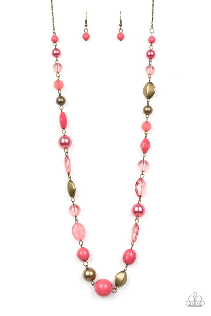 Varying in opacity and shape, a collection of polished, pearly, and glassy pink beads link with antiqued brass beads across the chest for a whimsical finish. Features an adjustable clasp closure.