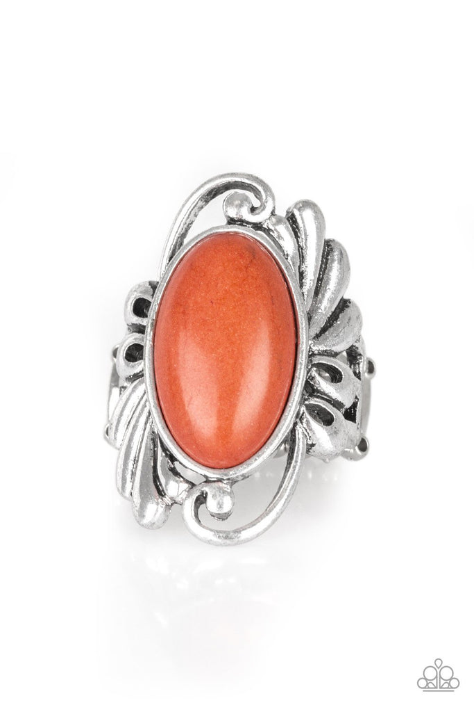 Chiseled into a smooth oval, a refreshing orange stone is pressed into the center of a glistening silver frame radiating with filigree detail for a seasonal look. Features a stretchy band for a flexible fit.