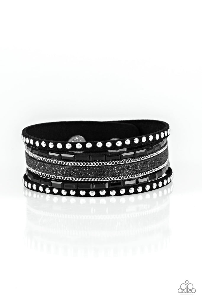 Shimmery silver studs, dainty silver chains, and black emerald style cut rhinestones are encrusted along a black suede band dusted in a sparkling center for a sassy look. Features an adjustable snap closure.