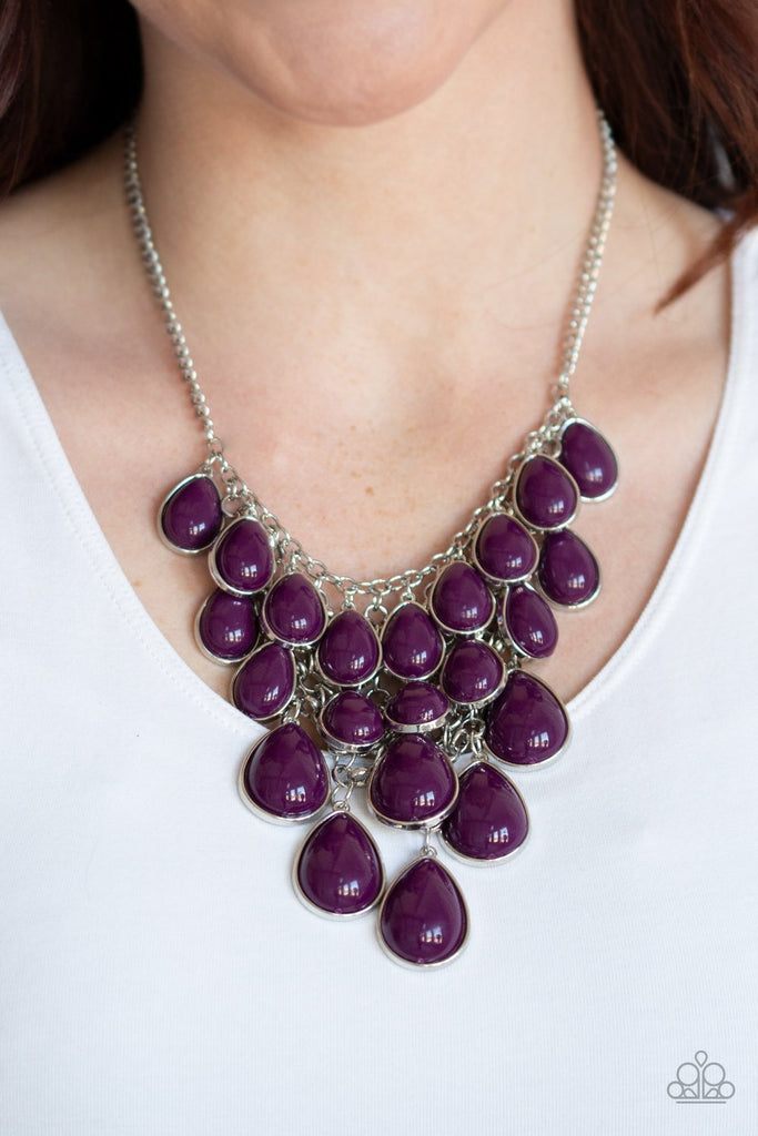 Tinted in the classic rich hue of plum, polished purple teardrops gradually increase in size as they trickle along rows of interconnected mesh chain. The vivacious beads drip into a tapered shape, creating a dramatic fringe below the collar. Features an adjustable clasp closure.