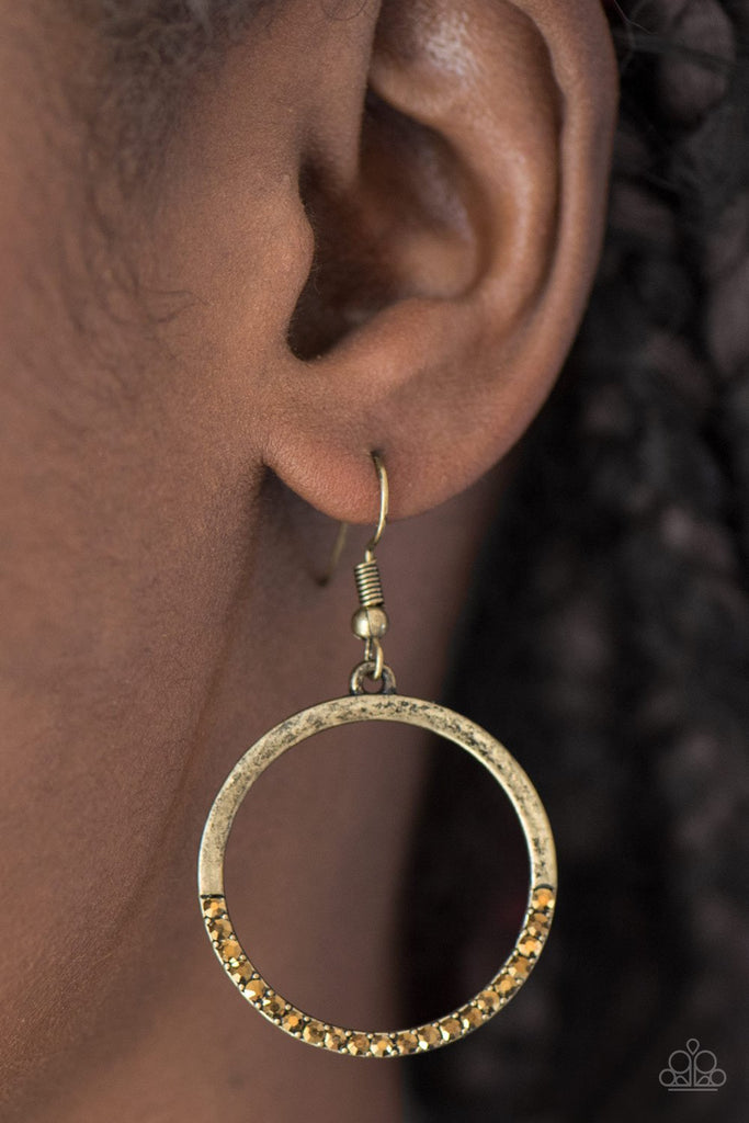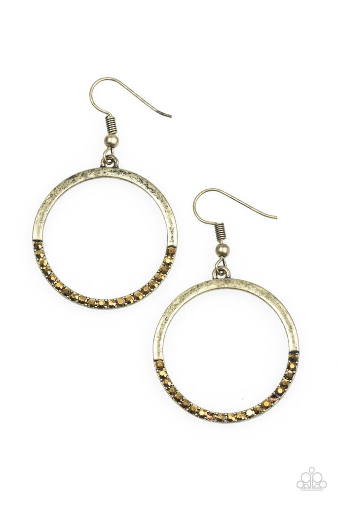 As if dipped in glitter, sparkling aurum rhinestones are encrusted along the bottom of a brass hoop, creating a bubbly lure. Earring attaches to a standard fishhook fitting.