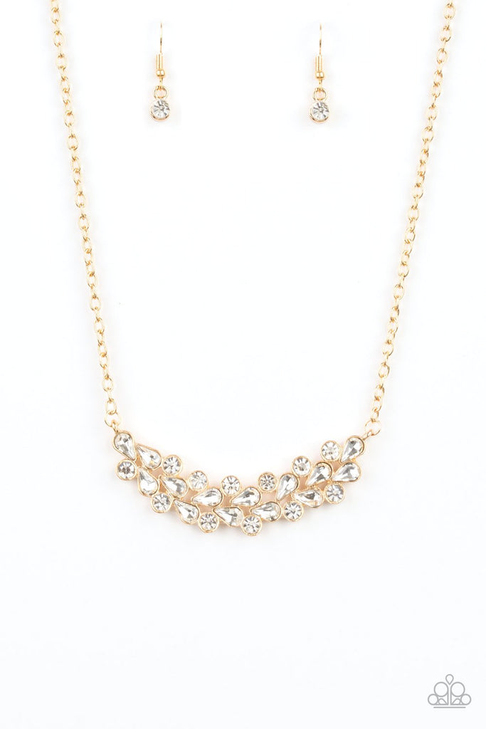 A collection of round and teardrop white rhinestones coalesce into a bowing gold pendant below the collar for a refined look. Features an adjustable clasp closure.