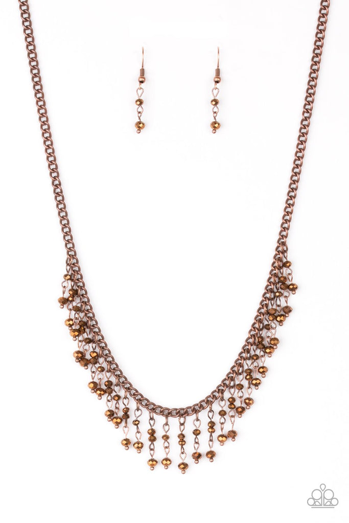 A collection of dainty coppery aurum crystal-like beads are threaded along stacks of metallic rods, creating a twinkling fringe below the collar. Features an adjustable clasp closure.