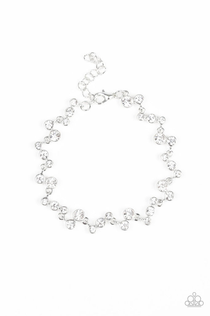 Encased in sleek silver fittings, mismatched white rhinestone encrusted frames link across the wrist in a timeless fashion. Features an adjustable clasp closure.