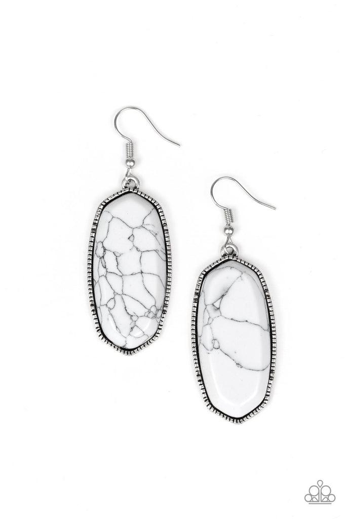Featuring a faux marble finish, a white stone is pressed into a studded silver frame for a seasonal flair. As the stone elements in this piece are natural, some color variation is normal. Earring attaches to a standard fishhook fitting.
