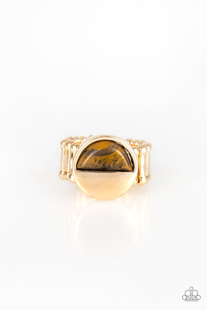 Chiseled into a tranquil crescent shape, a radiant Tiger's Eye stone is pressed into the bottom half of a circular gold frame for an on-trend look. Features a stretchy band for a flexible fit.