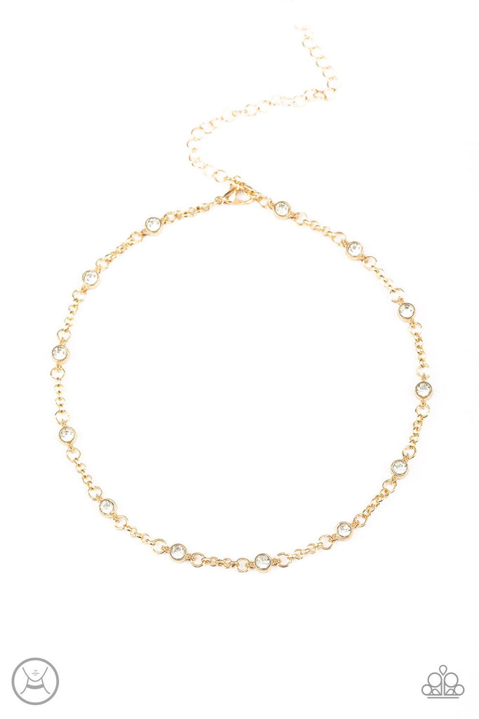 Glassy white rhinestones dot a dainty gold chain around the neck for a stunning look. Features an adjustable clasp closure.