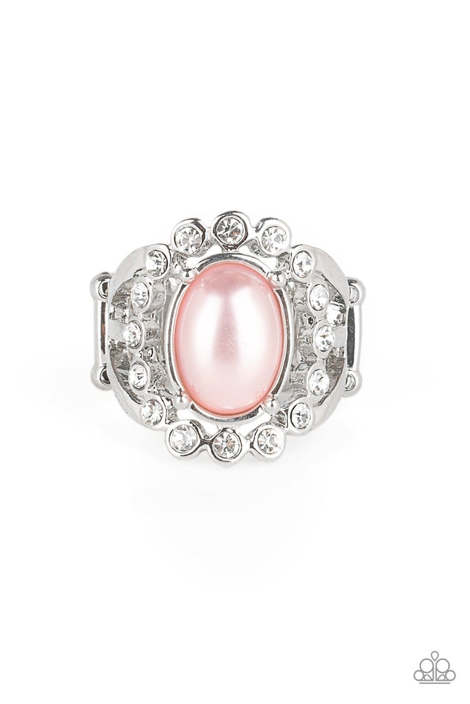 A ring of glassy white rhinestones spins around a pearly pink center, creating a refined statement piece atop the finger. Features a stretchy band for a flexible fit.