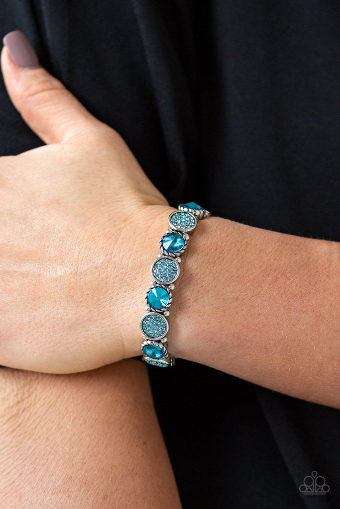Featuring an array of glittery blue rhinestones, mismatched silver frames and dainty silver beads are threaded along stretchy bands around the wrist for a glamorous flair.
