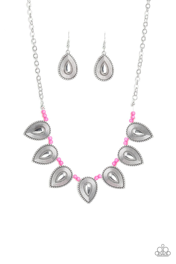 A collection of dainty pink stone beads and ornate silver teardrop frames are threaded along an invisible wire below the collar for a fierce tribal look. Features an adjustable clasp closure.