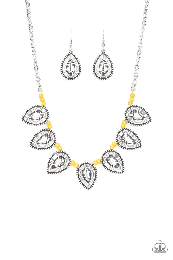 A collection of dainty yellow stone beads and ornate silver teardrop frames are threaded along an invisible wire below the collar for a fierce tribal look. Features an adjustable clasp closure.