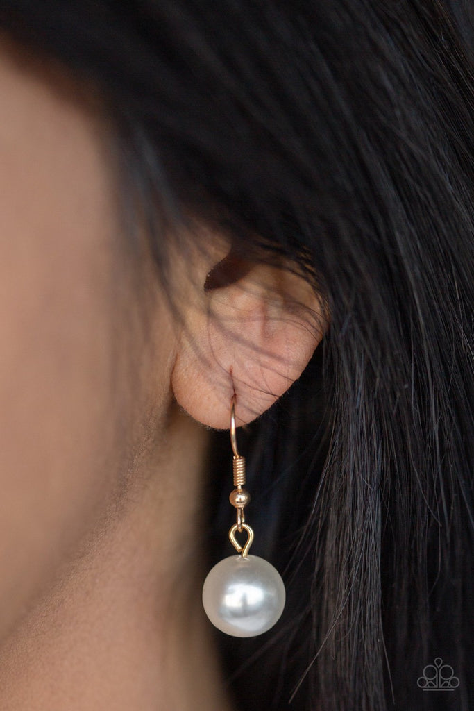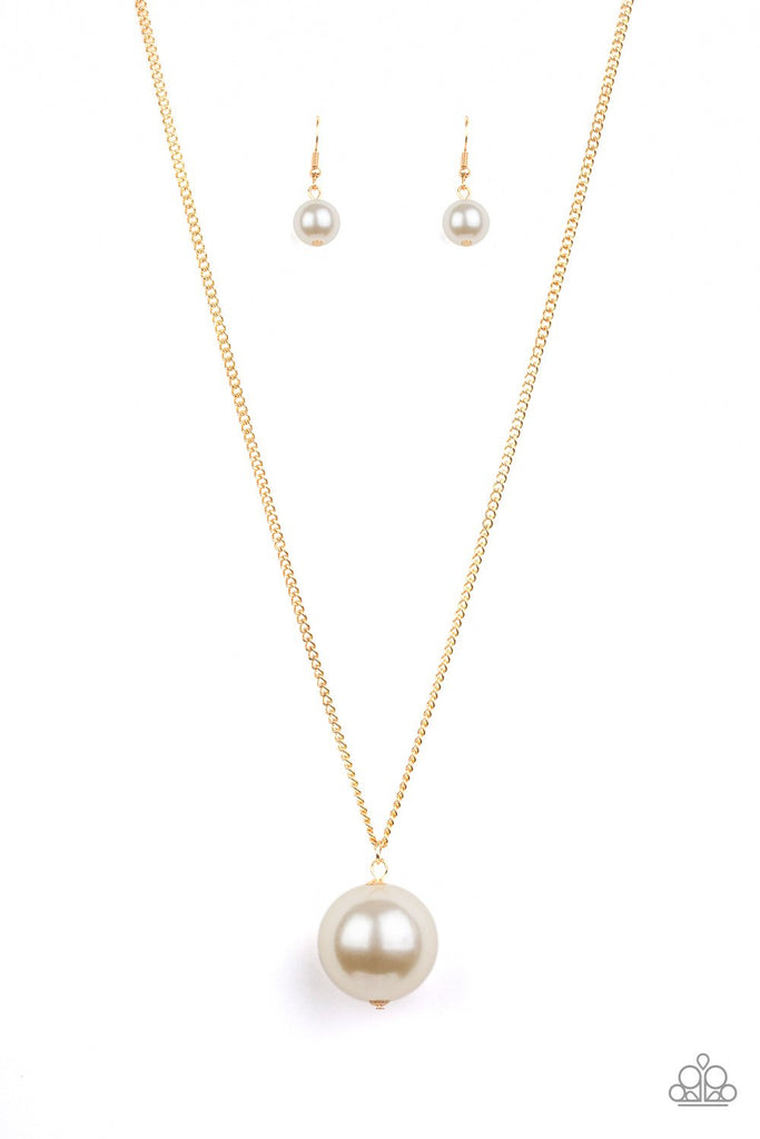 An oversized white pearl pendant swings from the bottom of a lengthened gold chain for a dramatic look. Features an adjustable clasp closure.