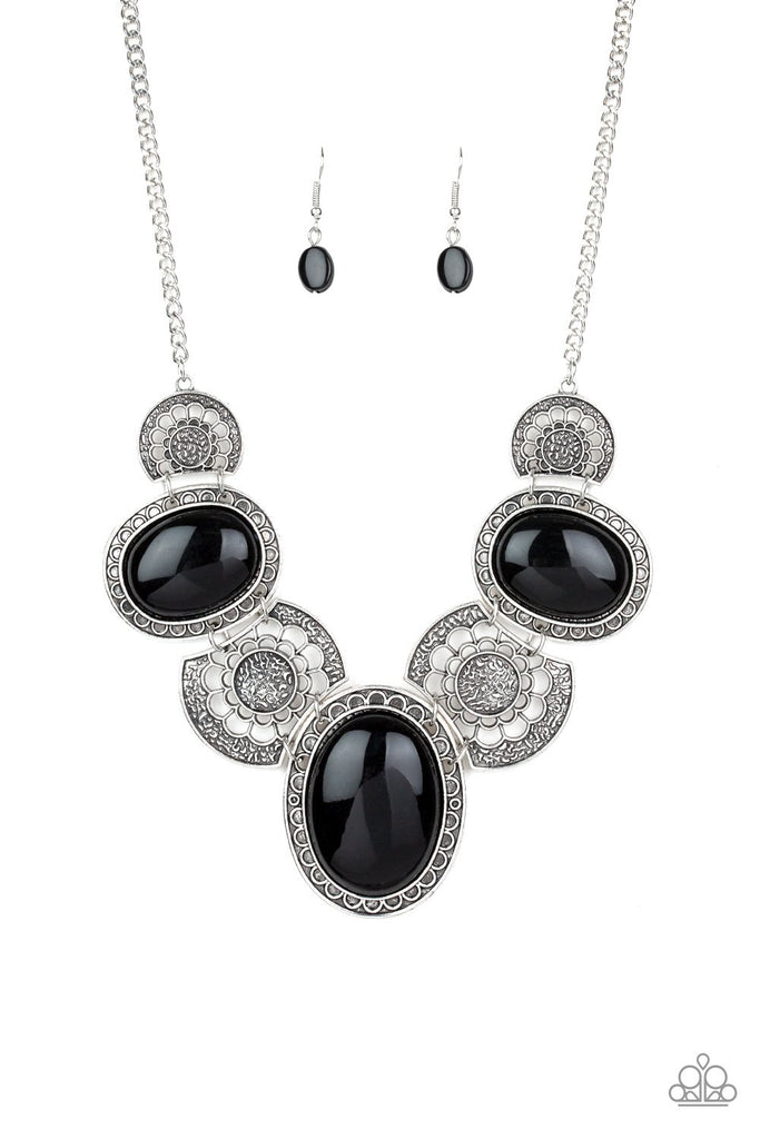Flat black beads connect with shimmery silver floral frames below the collar, creating a colorful medallion-like statement piece with a vintage inflection. Features an adjustable clasp closure.