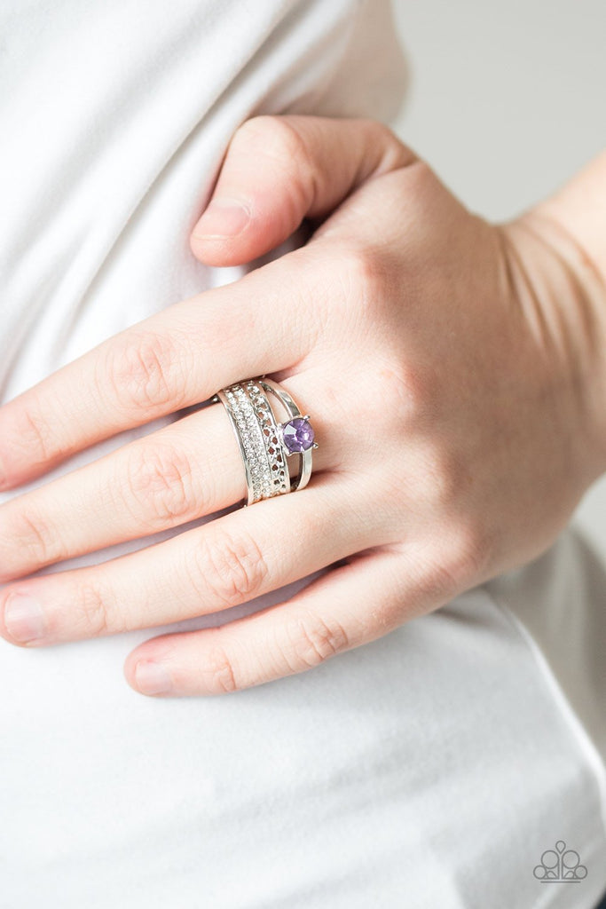 A white rhinestone encrusted, decorative silver, and shiny silver band stack across the finger. A glittery purple rhinestone crowns the uppermost band for a regal finish. Features a stretchy band for a flexible fit.