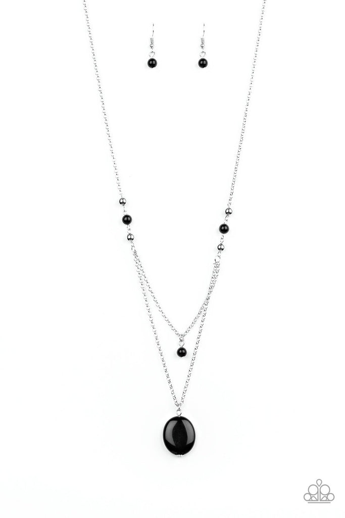 Rows of dainty silver and glassy black beads give way to two shimmery silver chain layers. A dainty black bead swings from the uppermost strand, while a glassy black stone pendant swings from the lowermost chain for a stacked look. Features an adjustable clasp closure.