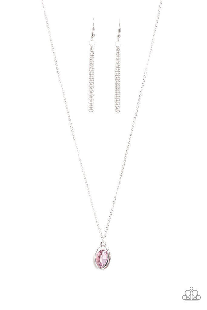 A twinkling pink gem is nestled inside of an abstract silver frame, creating a timeless pendant below the collar. Features an adjustable clasp closure.