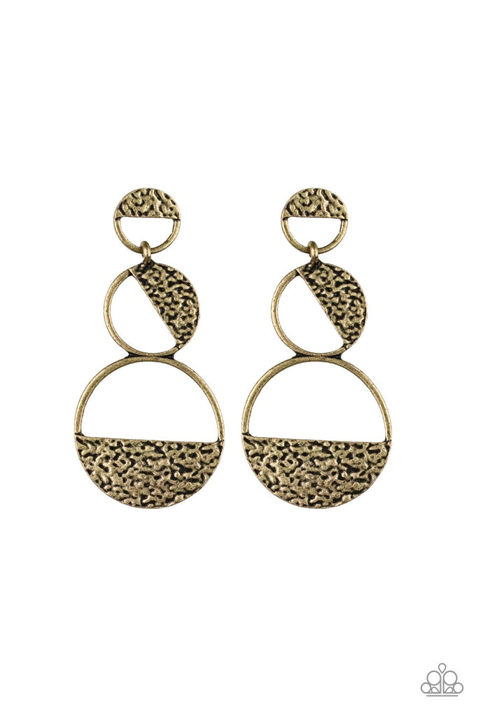 Infused with delicately hammered half moon frames, a trio of glistening brass rings gradually increase in size as they trickle from the ear for a trendy vibe. Earring attaches to a standard post fitting.