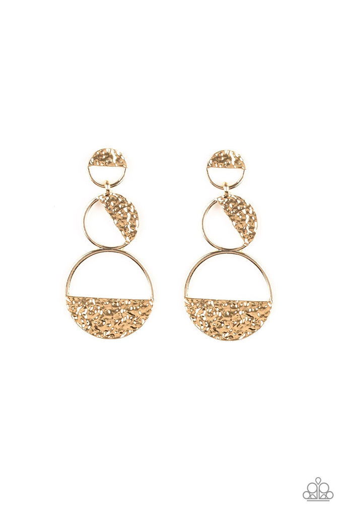 Infused with delicately hammered half moon frames, a trio of glistening gold rings gradually increase in size as they trickle from the ear for a trendy vibe. Earring attaches to a standard post fitting.