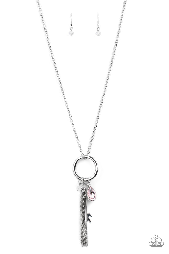 A pink teardrop gem, silver key, dainty crystal-like bead, and shimmery silver chain tassel swing from the bottom of a silver ring at the bottom of a lengthened silver chain, creating a whimsically tasseled display. Features an adjustable clasp closure.