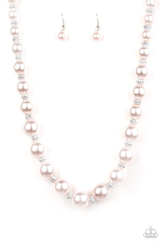 Infused with dainty silvery rhinestone encrusted beads, a refined collection of oversized pink pearls are threaded along an invisible wire below the collar for timeless dazzle. Features an adjustable clasp closure.