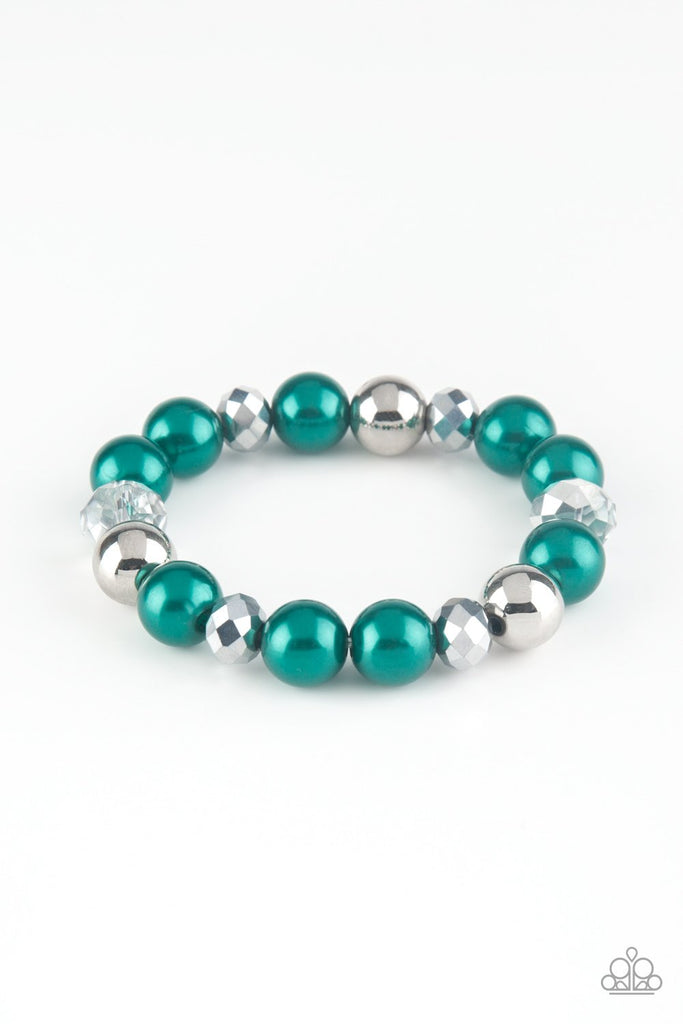 A collection of pearly green, classic silver, and crystal-like hematite beads are threaded along a stretchy band, creating a refined look around the wrist.
